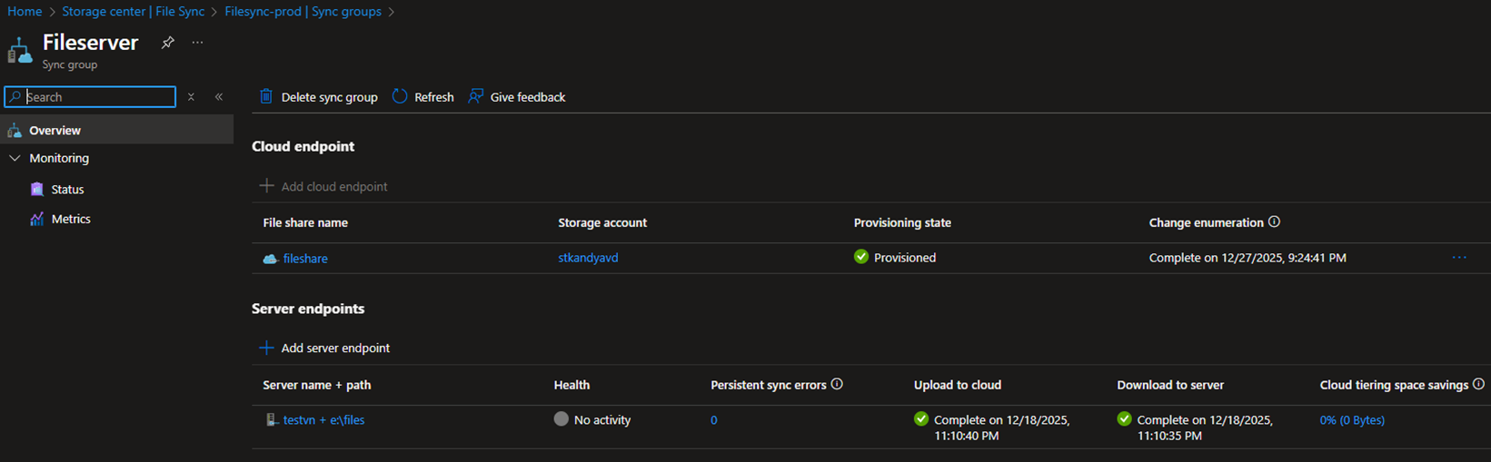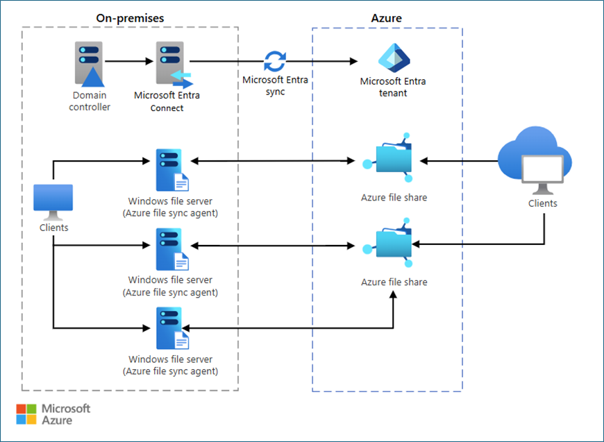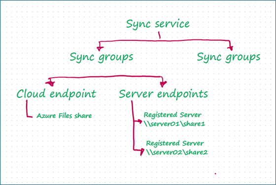 Sync group - A sync group is like a container or rule set that defines which folders should stay in sync. Everything within the same sync group will always remain the same (same files, changes replicate). The Sync group consists of Cloud endpoints and Server endpoints.