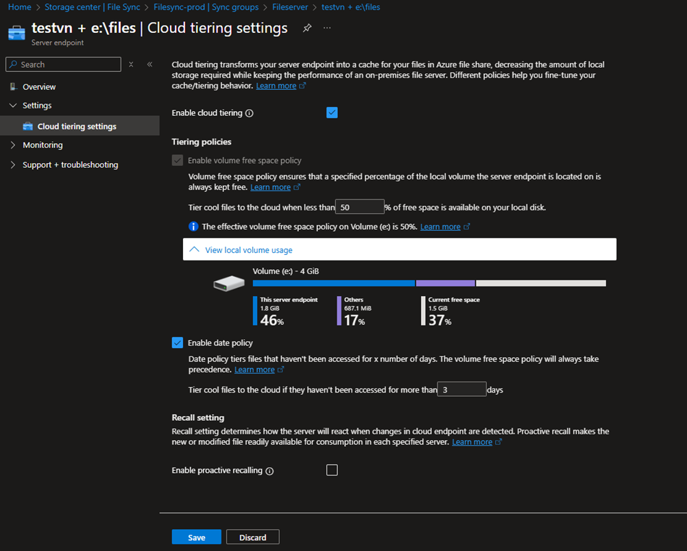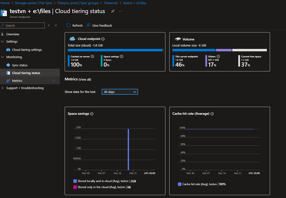 After configuring cloud tiering policies, you can monitor their status from the server endpoint view. This view provides visibility into the volume size, local cache size, and tiering configuration, allowing you to track how cloud tiering is operating. Additionally, it shows the current cloud tiering status, helping you quickly assess whether the server is functioning within the expected thresholds.