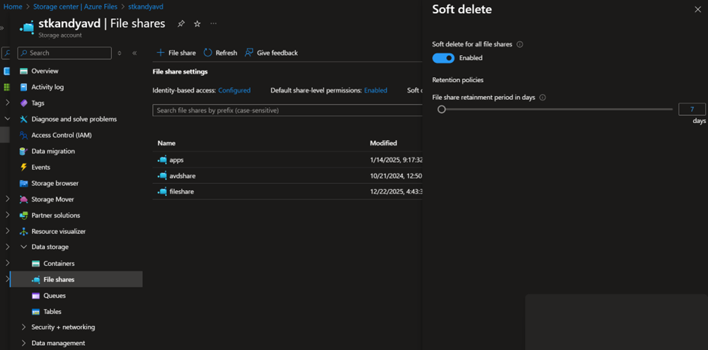 The soft delete feature helps prevent accidental loss of data. At the file share level, you can set a soft delete retention period. During this time, deleted files are not permanently removed and can be restored within the specified date range. Once the retention period ends, the files are automatically and permanently deleted.