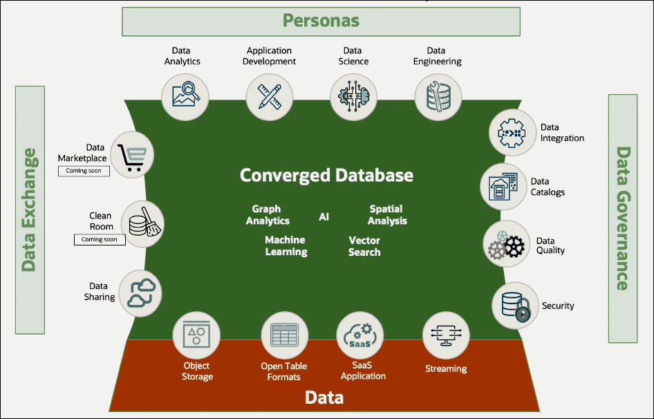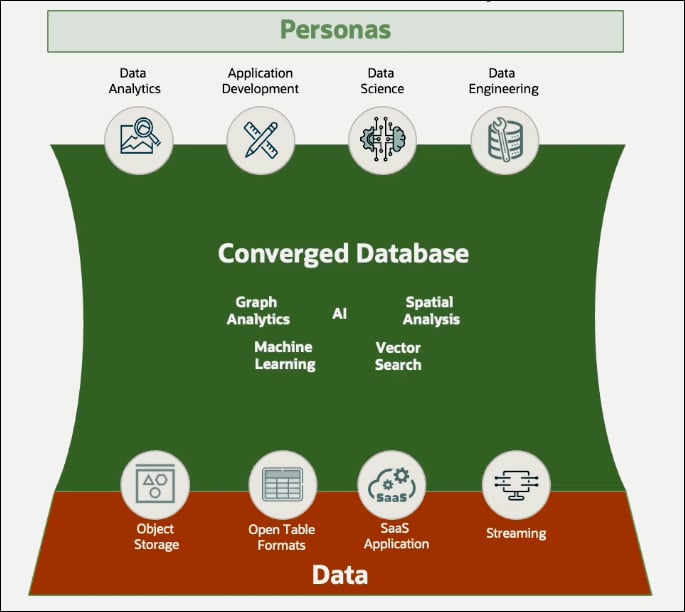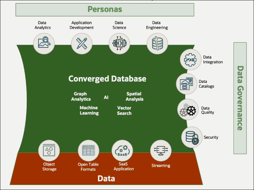 The process begins with data. Data can be sourced from object stores, other Clouds, SaaS applications, on-premises database applications, and streaming sources, all integrated into Oracle Database 23ai. This is a converged database platform, capable of managing data while providing a broad range of analytics. Autonomous Database is much more than a traditional database; it serves as a complete ecosystem for data analytics. The converged database is designed to support multiple personas. Data analysts allow access to data modeling and visualization tools, while developers benefit from a low-code application development environment for quickly building analytic applications. Data scientists can use an end-to-end machine learning environment, and data engineers are equipped with powerful transformation tools. All these capabilities are natively built into an Autonomous Database, eliminating the need to integrate into other Cloud services or products.