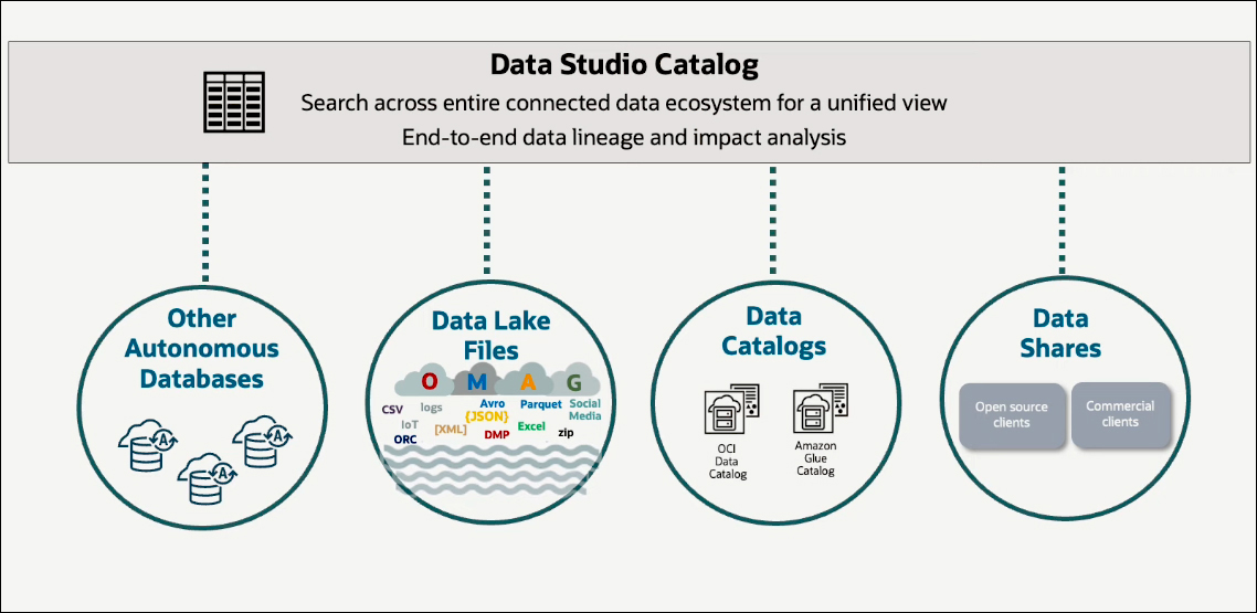 It begins with understanding what data is available. In Autonomous Database, the Data Studio catalog serves as a centralized location where users can view all accessible data from their database and other Autonomous Databases, object storage, data lake files, and external data catalogs or data shares. This data catalog offers a comprehensive overview of the entire data ecosystem that can be accessed, queried, and processed with an Autonomous Database. It provides critical information about the data, including lineage, which indicates the source of the data. This helps users understand what data is available and which can be used.