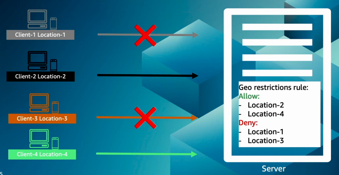 In this third example, Amazon CloudFront is configured with multiple origins, such as Amazon S3 and an Application Load Balancer. With CloudFront, you can implement geographic restrictions by either creating an allow list to permit access from specific countries or a block list to deny access to certain countries. Similar to the previous examples, you can integrate other services like Route 53 and AWS WAF to implement more complex geographic restrictions. It's important to note that when using WAF with CloudFront, the geo-restriction rules in CloudFront are applied first. These rules filter out users based on the defined allow or block lists, and CloudFront forwards the allowed requests to WAF for further inspection.