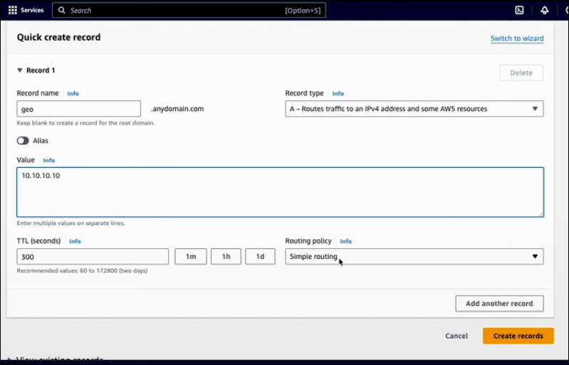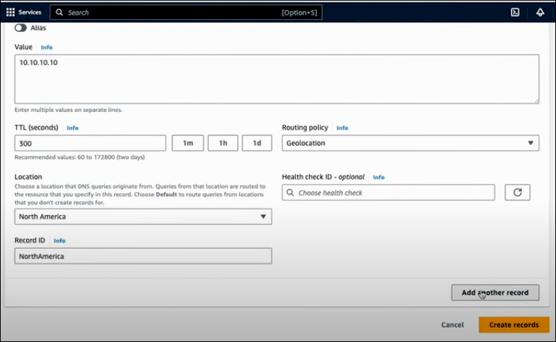 You can provide a Record name, and it's important to create multiple records with the same name, each pointing to different targets associated with various geographic locations. For example, you might create two records for continents: one for North America and another for South America. Also, you can create more granular records for individual countries, and within the U.S., you can further refine your records to specify individual states.