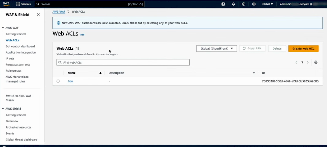 Next, navigate to Web ACLs in the AWS Management Console, where you will find your Web ACL. Click on it to add a rule for geographic location restrictions.
