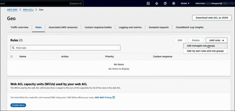 Go to Rules and click on Add Rules. Here, you have the option to use managed rules (Add managed rule groups) or create your own custom rules (Add my own rules and rule groups).