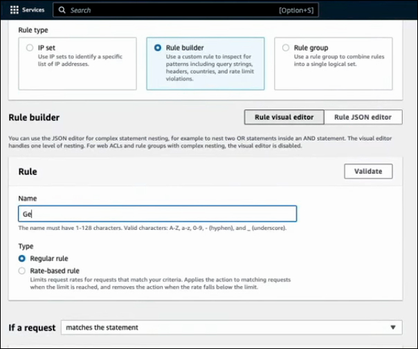 When adding a rule, choose the Rule Type and assign it a Name. You can select either a Regular Rule or a Rate-Based Rule. A Regular Rule will apply continuously, while a Rate-Based Rule monitors the source IP and limits requests based on the number of requests received over a specified period.
