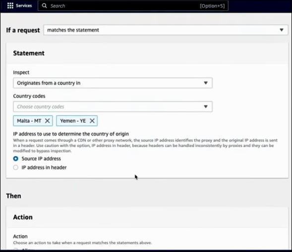 When setting up the rule, you can choose to determine whether the request is originating from the Source IP address or the IP address in header. This choice is important because there may be CDNs in front of your resources that receive traffic and forward it to you. If you select Source IP and there is a CDN in place, you will only be checking the IP addresses of the CDN, which may not be useful for geographic restrictions. Instead, you should inspect the Source IP address provided in the headers, as CDNs add the IP addresses in the headers. On the other hand, if you know that no CDNs or proxies are involved and users connect directly to your services, you can rely on the Source IP addresses in the request.