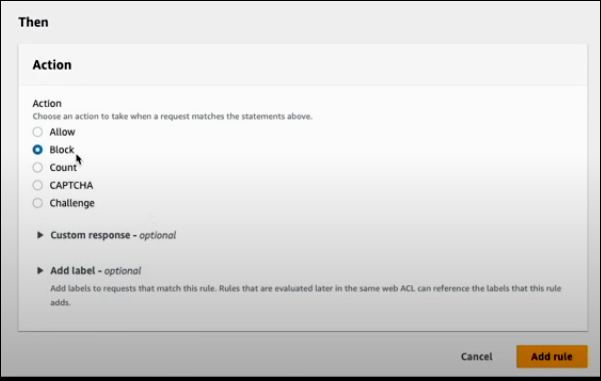 Next, you need to define the Action. You have several options: Allow, Block, Count, CAPTCHA, or Challenge. After selecting the action, click Add rule to finalize the configuration.