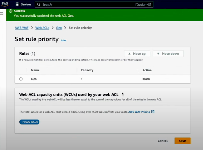 After validating your rule, you can adjust priority by moving it up if you have other rules in your Web ACL. Once the priority is set, click Save. Your Web ACL for AWS WAF will include this rule, implementing geolocation restrictions based on the specified countries.