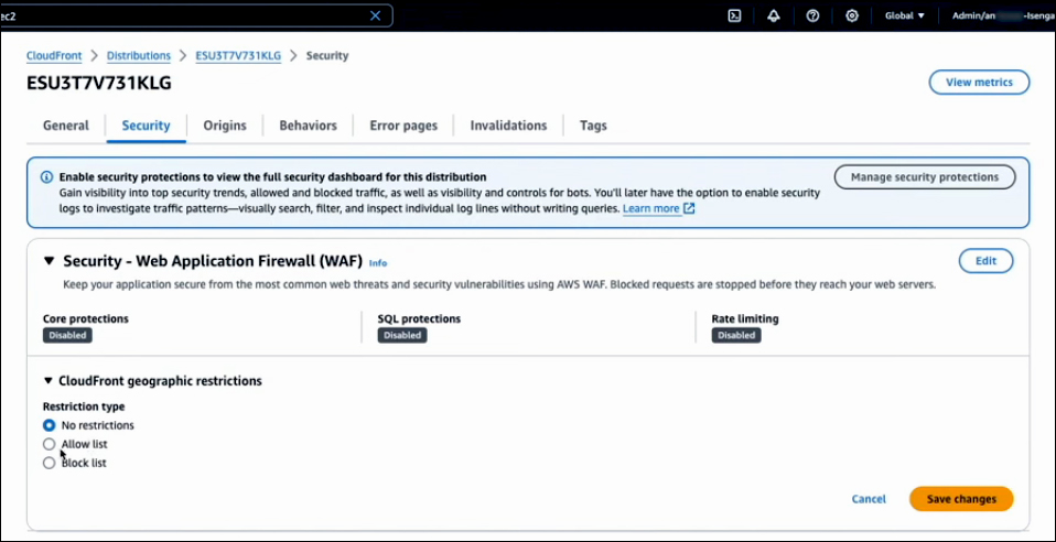 You can choose either an Allow List or a Block List. Select the Countries you want to include in your chosen list. Once you have made your selections, click Save Changes. CloudFront will now enforce these geographic restrictions, allowing or blocking access based on the countries specified in your list.