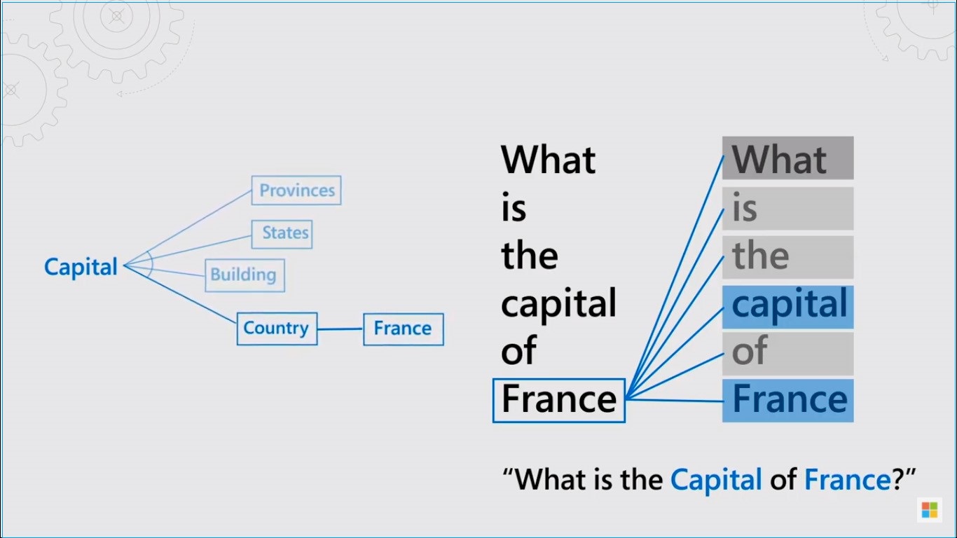 After solved for recall, it needs to solve for precision in results. The transformer, a novel neural network architecture, enables you to think about semantic similarity, not just individual words but of sentences and paragraphs. It uses an attention mechanism to understand long-range dependencies in terms in ways that were impractical before. Implementation starts with the Microsoft-developed Turing family of models that have billions of parameters. Then go through a domain specialization process where we train models to predict relevance using data from Bing. For example, when you search for the capital of France (What is the capital of France?), by reading the whole phrase, it’s able to identify the dependency between capital and France as a country that puts capital in context and quickly returns results with high confidence, in this case for Paris.