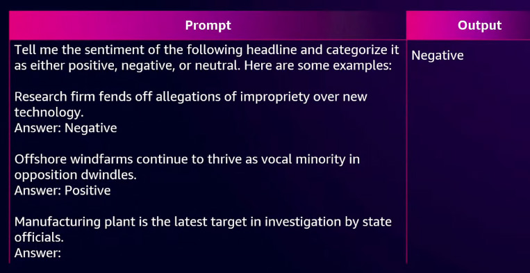 With few-shot prompting, you provide examples or output samples within your prompt to guide the model's response. For example, suppose you want to determine whether a paragraph expresses a positive, negative, or neutral sentiment. In that case, you include a few labelled examples of similar text and their corresponding sentiment classifications. By doing so, the model gains context and a clearer understanding of the expected output.