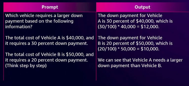 With chain-of-thought prompting, complex questions are broken down into smaller, sequential steps. Instead of asking a single long question, you structure the prompt into a series of smaller, logical sub-questions, guiding the model to reason step by step. This approach improves accuracy and helps the model generate more structured and coherent responses.