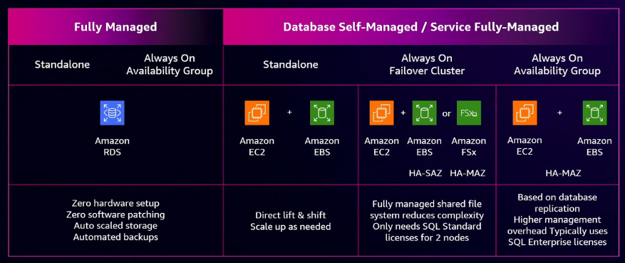 For Microsoft SQL Server on AWS, organizations can choose from multiple deployment options based on their application requirements: