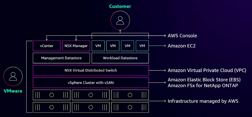 When running VMware workloads on AWS, the transition from on-premises environments is designed to feel familiar to administrators. The components that organizations use every day in their data centers map directly to AWS services. For example, vCenter functionality is available through the AWS Management Console. Virtual machines in VMware translate directly to Amazon EC2 instances, enabling cloud scalability. Networking is also simplified through Amazon VPC, which serves as the cloud equivalent of the NSX Virtual Distributed Switch, providing a secure virtual network for launching and managing AWS resources. For storage, vSphere with vSAN maps to Amazon EBS for boot volumes, while data volumes can be configured with Amazon FSx to deliver the best TCO for virtualized applications.