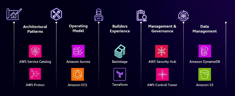 Architectural patterns: Modern applications rely on modular services. By breaking applications into smaller, independent components, teams can develop and scale parts of the system without disrupting the whole. This modularity not only improves agility but also enables the use of the best technology for each component. Common patterns, such as event-driven microservice architectures, can then be defined and made easily accessible to developers through services like AWS Service Catalog and AWS Proton.